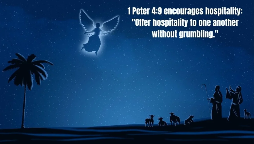 1 Peter 4:9 encourages hospitality: “Offer hospitality to one another without grumbling.”